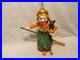 This is an ornament that uses multiple materials. The witches head and Body are a blown glass ornament. Her skirt is crepe paper. Her legs are twisted black and orange pipestem cleaners while her orange shoes are wood. She sits on a wood dowel broom handle. The broom is made of straw. She holds an […]